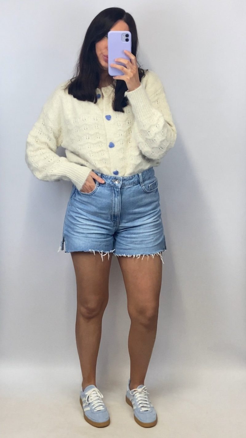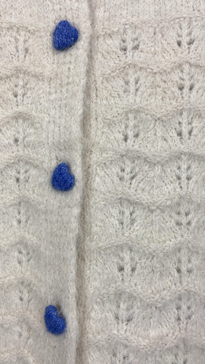 Gilet beige structuré, ajouré & légèrement pailleté, boutons bleu en forme de cœur (doux – ne pique pas)